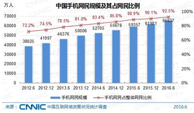 截至2016年12月,我國手機網(wǎng)民規(guī)模達6.95億,